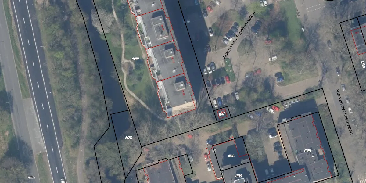 Het perceel waarop Adama van Scheltemaplein 76 staat heeft een oppervlakte van 4101 m². Dit is een zeer groot perceel. De perceeloppervlakte wordt geregistreerd door het Kadaster. Gedetailleerde informatie over de maten van dit perceel kunt u vinden in het rapport Kadastrale kaart met maatvoering van Adama van Scheltemaplein 76.