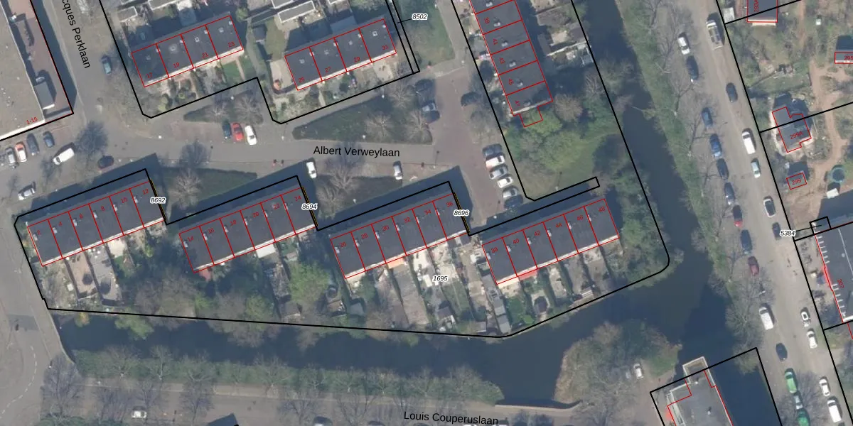 Het perceel waarop Albert Verweylaan 34 staat heeft een oppervlakte van 5842 m². Dit is een zeer groot perceel. De perceeloppervlakte wordt geregistreerd door het Kadaster. Gedetailleerde informatie over de maten van dit perceel kunt u vinden in het rapport Kadastrale kaart met maatvoering van Albert Verweylaan 34.
