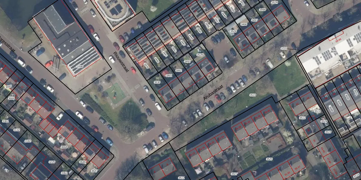Arubastraat 5 is gelegen op kadastraal perceel DEL00N3491. Deze kadastrale aanduiding is uniek en wordt gebruikt door het Kadaster om eigendomsrechten en andere zakelijke rechten vast te leggen. Het perceel maakt onderdeel uit van de kadastrale gemeente Delft.