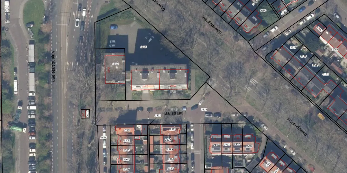 Balistraat 55 is gelegen op kadastraal perceel DEL00N2695. Deze kadastrale aanduiding is uniek en wordt gebruikt door het Kadaster om eigendomsrechten en andere zakelijke rechten vast te leggen. Het perceel maakt onderdeel uit van de kadastrale gemeente Delft.