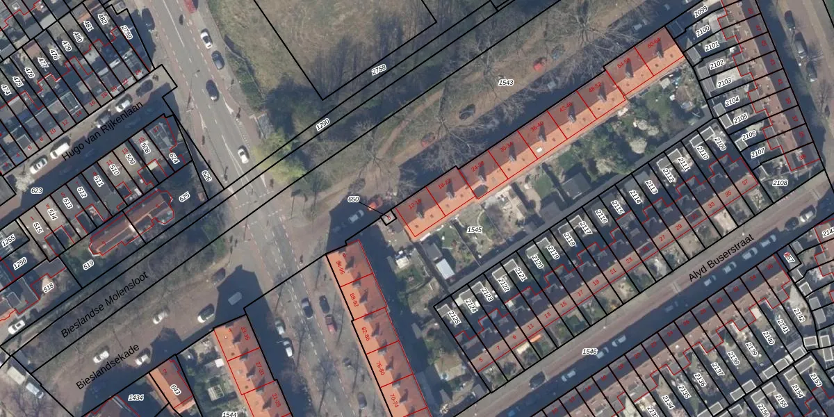 Het perceel waarop Bieslandsekade 16 staat heeft een oppervlakte van 2985 m². Dit is een zeer groot perceel. De perceeloppervlakte wordt geregistreerd door het Kadaster. Gedetailleerde informatie over de maten van dit perceel kunt u vinden in het rapport Kadastrale kaart met maatvoering van Bieslandsekade 16.