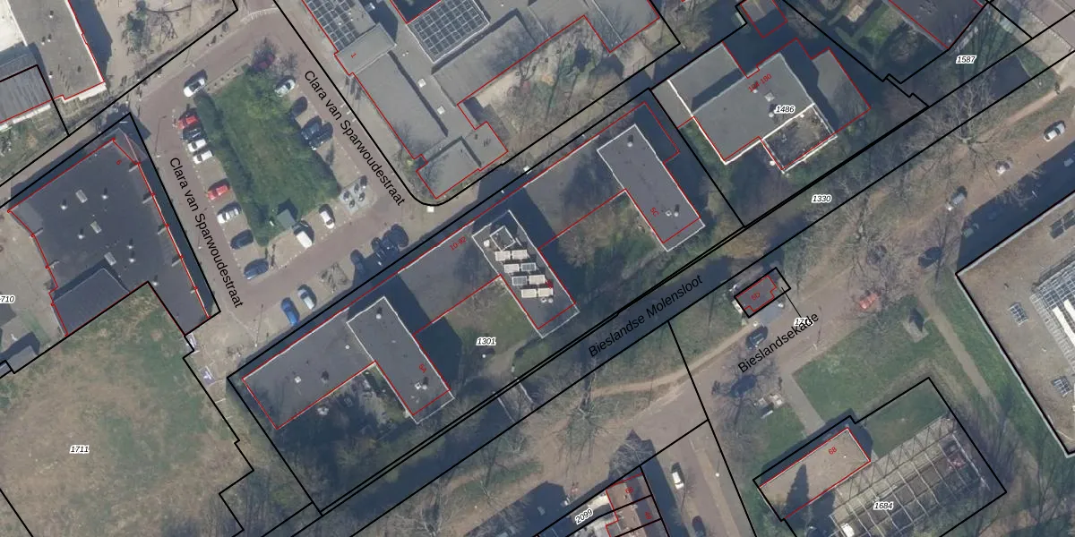 Het perceel waarop Bieslandsekade 5-B staat heeft een oppervlakte van 2934 m². Dit is een zeer groot perceel. De perceeloppervlakte wordt geregistreerd door het Kadaster. Gedetailleerde informatie over de maten van dit perceel kunt u vinden in het rapport Kadastrale kaart met maatvoering van Bieslandsekade 5-B.