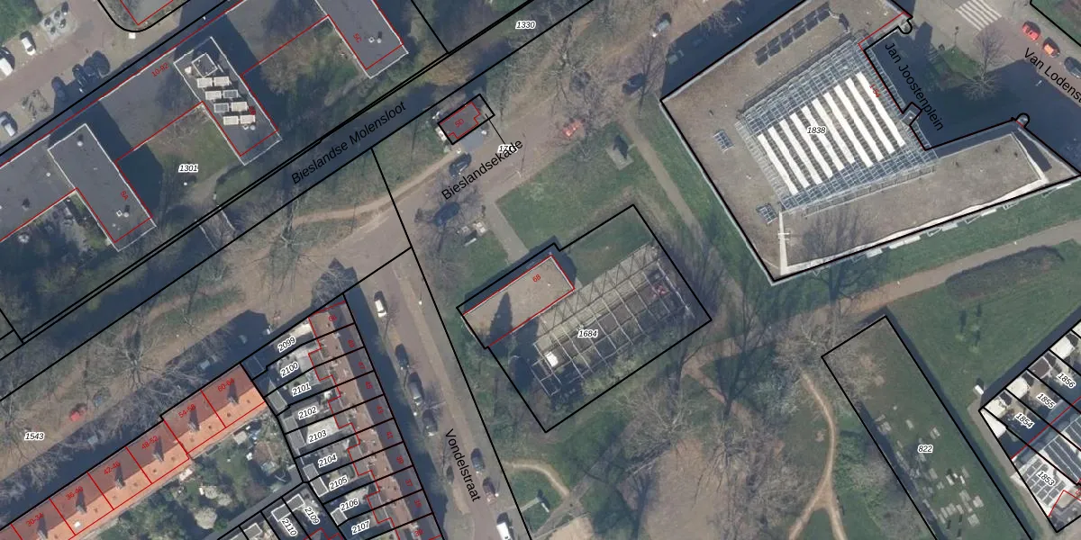Het perceel waarop Bieslandsekade 68 staat heeft een oppervlakte van 1017 m². Dit is een zeer groot perceel. De perceeloppervlakte wordt geregistreerd door het Kadaster. Gedetailleerde informatie over de maten van dit perceel kunt u vinden in het rapport Kadastrale kaart met maatvoering van Bieslandsekade 68.