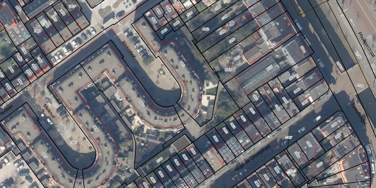 Het perceel waarop Blekerhof 39 staat heeft een oppervlakte van 1103 m². Dit is een zeer groot perceel. De perceeloppervlakte wordt geregistreerd door het Kadaster. Gedetailleerde informatie over de maten van dit perceel kunt u vinden in het rapport Kadastrale kaart met maatvoering van Blekerhof 39.