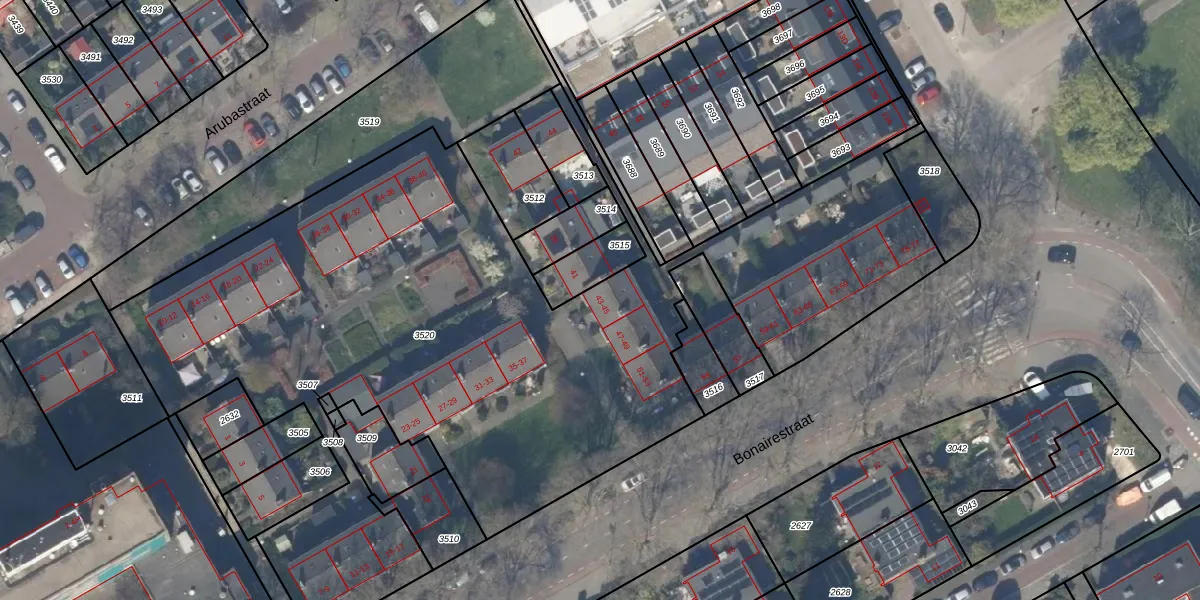 Het perceel waarop Bonairestraat 43 staat heeft een oppervlakte van 4669 m². Dit is een zeer groot perceel. De perceeloppervlakte wordt geregistreerd door het Kadaster. Gedetailleerde informatie over de maten van dit perceel kunt u vinden in het rapport Kadastrale kaart met maatvoering van Bonairestraat 43.
