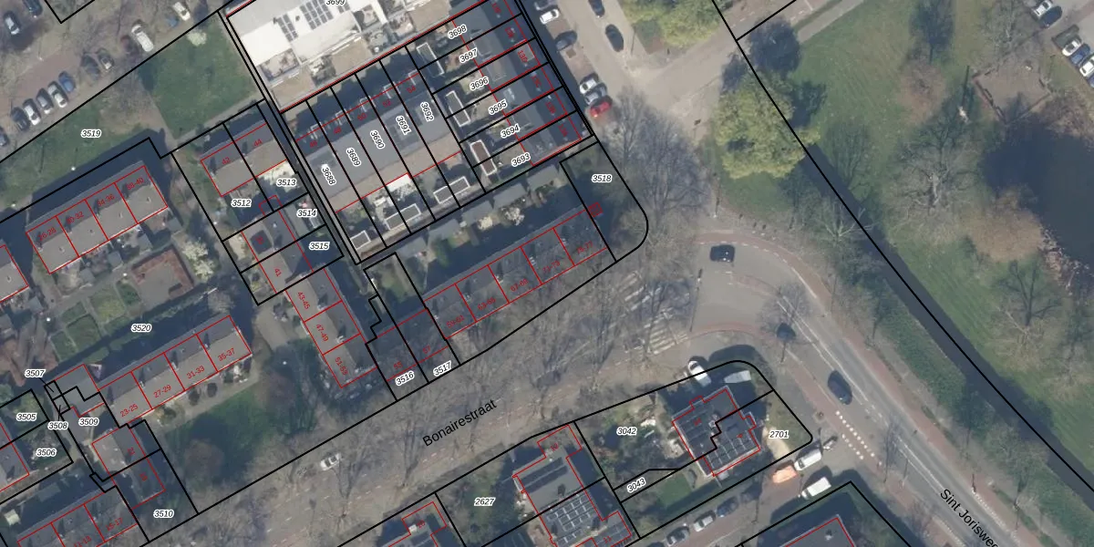 Het perceel waarop Bonairestraat 71 staat heeft een oppervlakte van 4669 m². Dit is een zeer groot perceel. De perceeloppervlakte wordt geregistreerd door het Kadaster. Gedetailleerde informatie over de maten van dit perceel kunt u vinden in het rapport Kadastrale kaart met maatvoering van Bonairestraat 71.