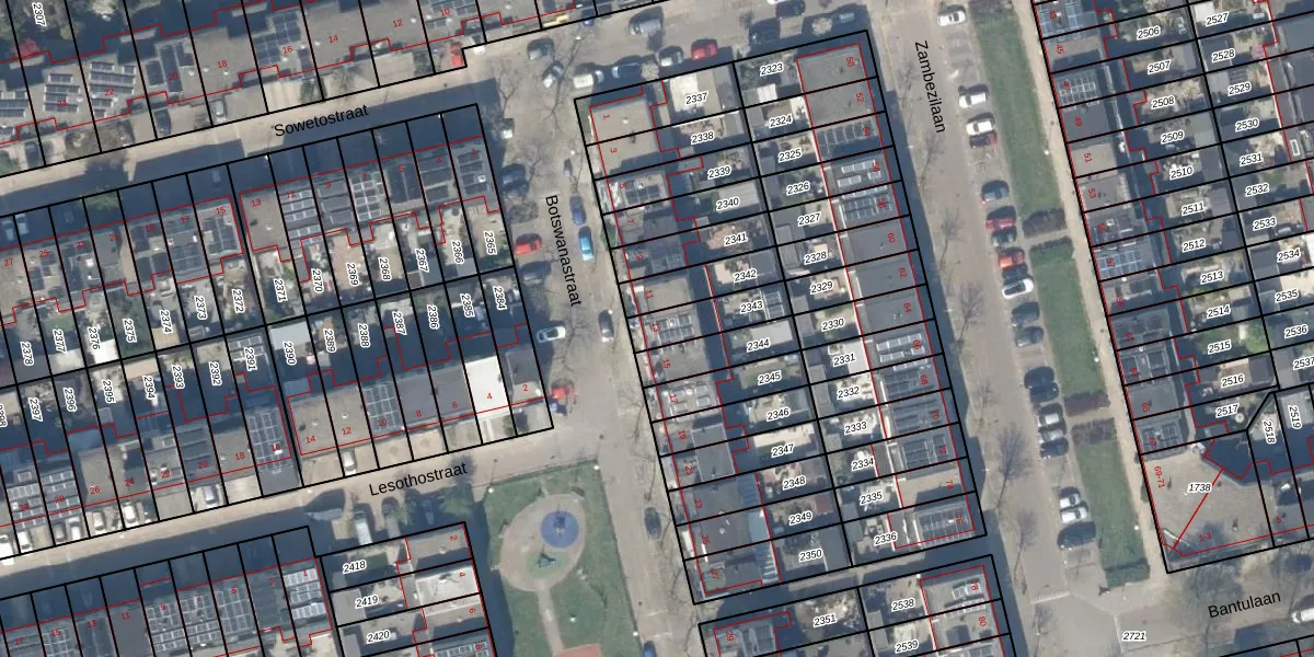 Botswanastraat 13 is gelegen op kadastraal perceel DEL00S2343. Deze kadastrale aanduiding is uniek en wordt gebruikt door het Kadaster om eigendomsrechten en andere zakelijke rechten vast te leggen. Het perceel maakt onderdeel uit van de kadastrale gemeente Delft.