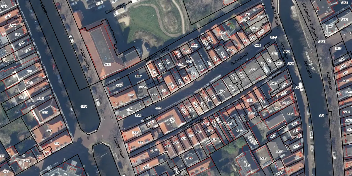 Het perceel waarop Breestraat 14 staat heeft een oppervlakte van 63 m². Dit is een klein perceel. De perceeloppervlakte wordt geregistreerd door het Kadaster. Gedetailleerde informatie over de maten van dit perceel kunt u vinden in het rapport Kadastrale kaart met maatvoering van Breestraat 14.