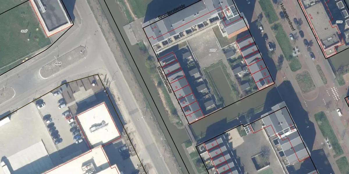 Broederstiende 19 is gelegen op kadastraal perceel DEL00V2237. Deze kadastrale aanduiding is uniek en wordt gebruikt door het Kadaster om eigendomsrechten en andere zakelijke rechten vast te leggen. Het perceel maakt onderdeel uit van de kadastrale gemeente Delft.