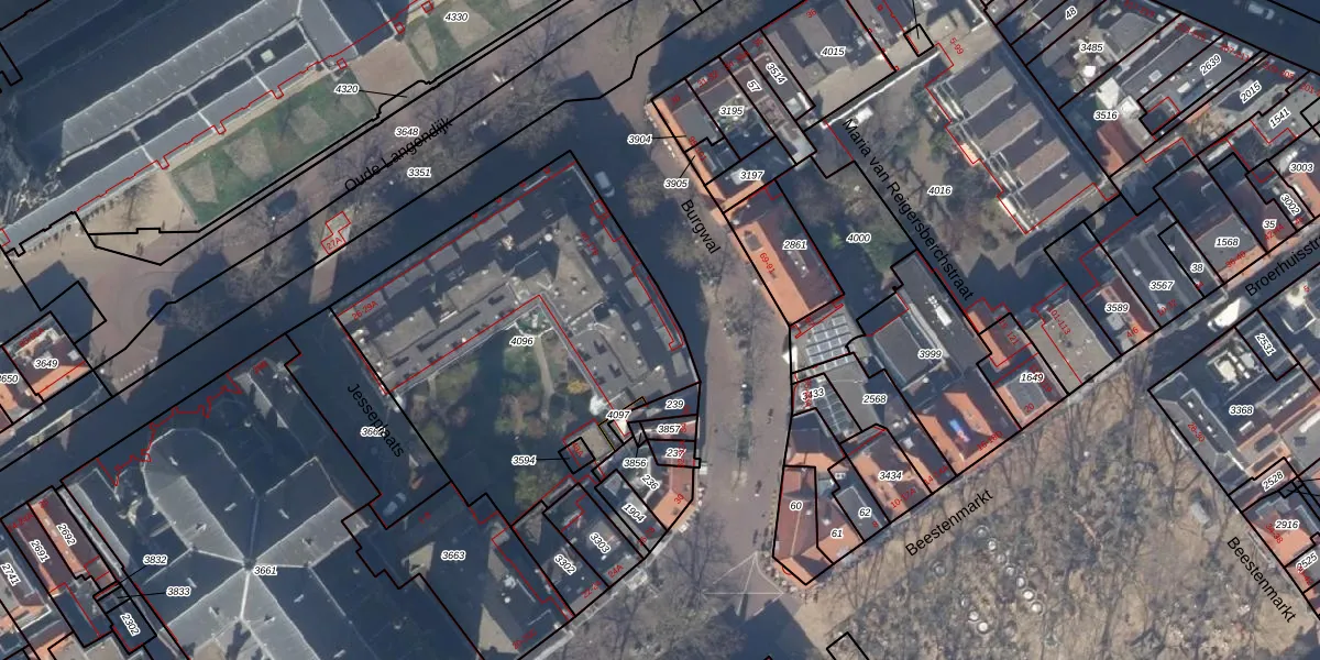 Het perceel waarop Burgwal 42 staat heeft een oppervlakte van 1655 m². Dit is een zeer groot perceel. De perceeloppervlakte wordt geregistreerd door het Kadaster. Gedetailleerde informatie over de maten van dit perceel kunt u vinden in het rapport Kadastrale kaart met maatvoering van Burgwal 42.