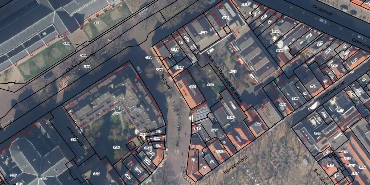 Het perceel waarop Burgwal 73 staat heeft een oppervlakte van 190 m². Dit is een middelgroot perceel. De perceeloppervlakte wordt geregistreerd door het Kadaster. Gedetailleerde informatie over de maten van dit perceel kunt u vinden in het rapport Kadastrale kaart met maatvoering van Burgwal 73.