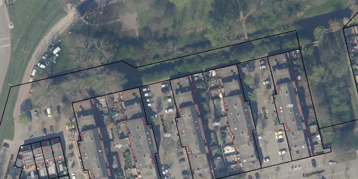 Het perceel waarop Dakarhof 38 staat heeft een oppervlakte van 2378 m². Dit is een zeer groot perceel. De perceeloppervlakte wordt geregistreerd door het Kadaster. Gedetailleerde informatie over de maten van dit perceel kunt u vinden in het rapport Kadastrale kaart met maatvoering van Dakarhof 38.