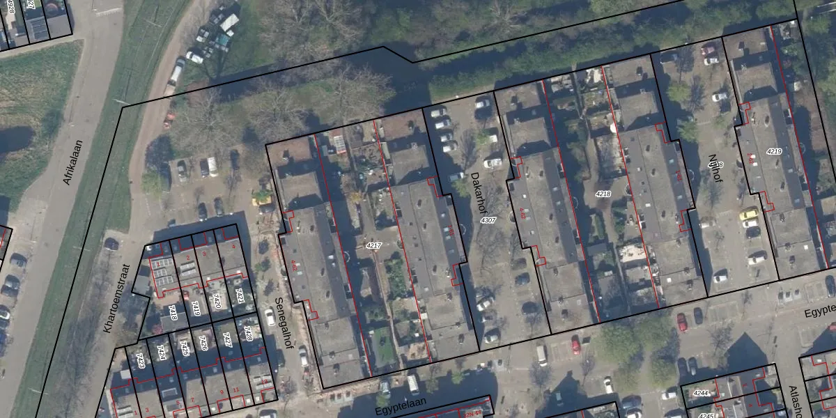 Het perceel waarop Dakarhof 55 staat heeft een oppervlakte van 2378 m². Dit is een zeer groot perceel. De perceeloppervlakte wordt geregistreerd door het Kadaster. Gedetailleerde informatie over de maten van dit perceel kunt u vinden in het rapport Kadastrale kaart met maatvoering van Dakarhof 55.