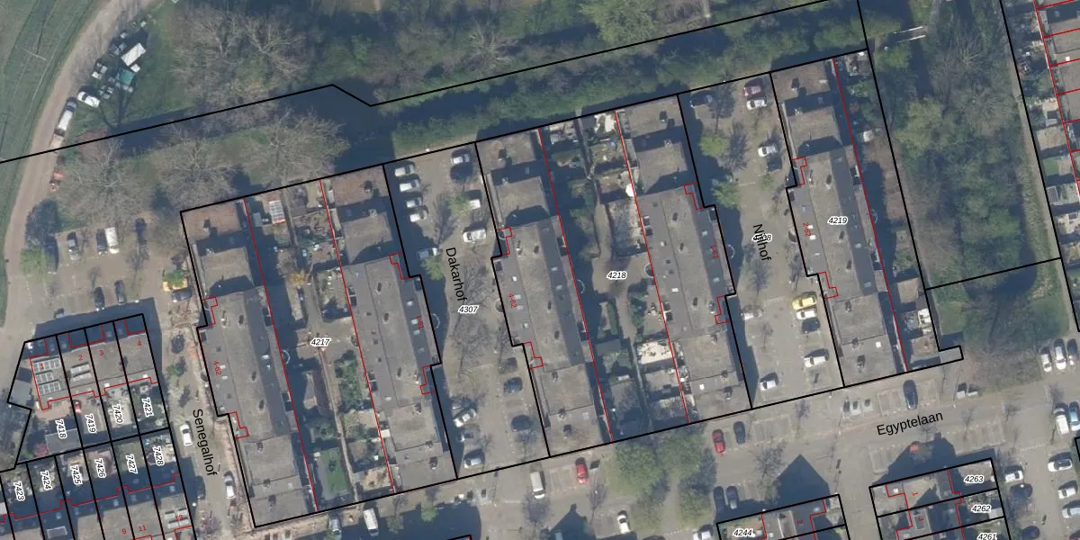 Het perceel waarop Dakarhof 56 staat heeft een oppervlakte van 2378 m². Dit is een zeer groot perceel. De perceeloppervlakte wordt geregistreerd door het Kadaster. Gedetailleerde informatie over de maten van dit perceel kunt u vinden in het rapport Kadastrale kaart met maatvoering van Dakarhof 56.