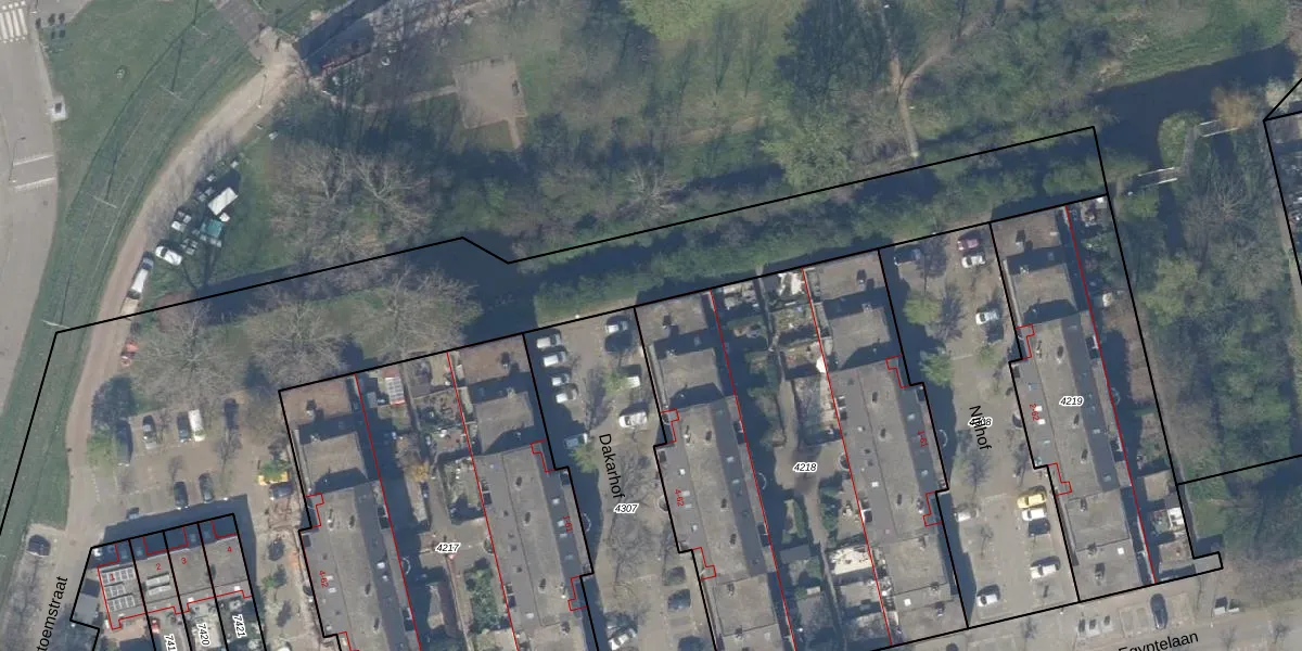 Het perceel waarop Dakarhof 62 staat heeft een oppervlakte van 2378 m². Dit is een zeer groot perceel. De perceeloppervlakte wordt geregistreerd door het Kadaster. Gedetailleerde informatie over de maten van dit perceel kunt u vinden in het rapport Kadastrale kaart met maatvoering van Dakarhof 62.