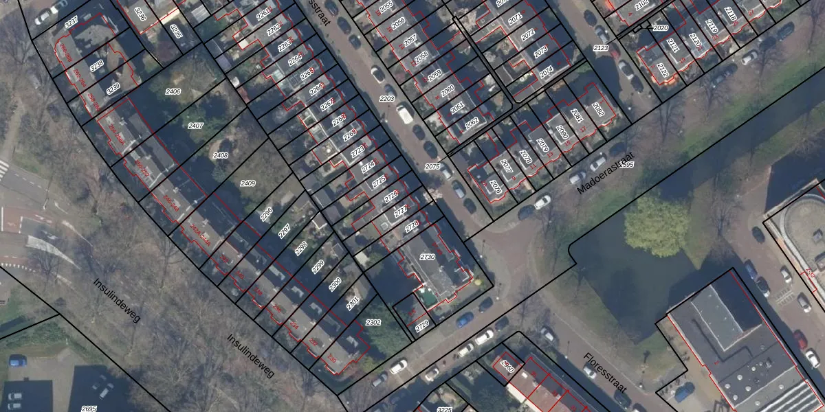 Het perceel waarop Floresstraat 47 staat heeft een oppervlakte van 108 m². Dit is een middelgroot perceel. De perceeloppervlakte wordt geregistreerd door het Kadaster. Gedetailleerde informatie over de maten van dit perceel kunt u vinden in het rapport Kadastrale kaart met maatvoering van Floresstraat 47.