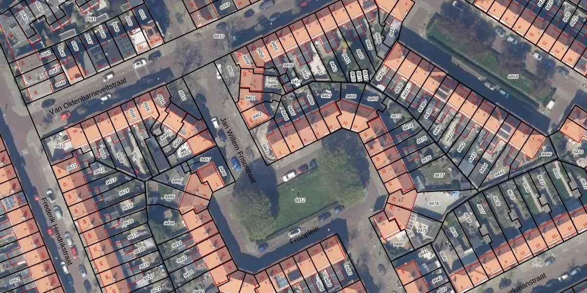 Het perceel waarop Frisoplein 4 staat heeft een oppervlakte van 80 m². Dit is een klein perceel. De perceeloppervlakte wordt geregistreerd door het Kadaster. Gedetailleerde informatie over de maten van dit perceel kunt u vinden in het rapport Kadastrale kaart met maatvoering van Frisoplein 4.