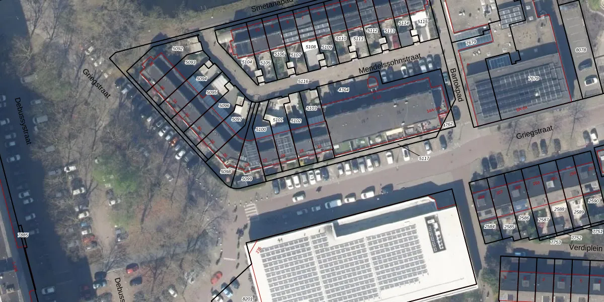 Griegstraat 18 is gelegen op kadastraal perceel DEL00R5102. Deze kadastrale aanduiding is uniek en wordt gebruikt door het Kadaster om eigendomsrechten en andere zakelijke rechten vast te leggen. Het perceel maakt onderdeel uit van de kadastrale gemeente Delft.
