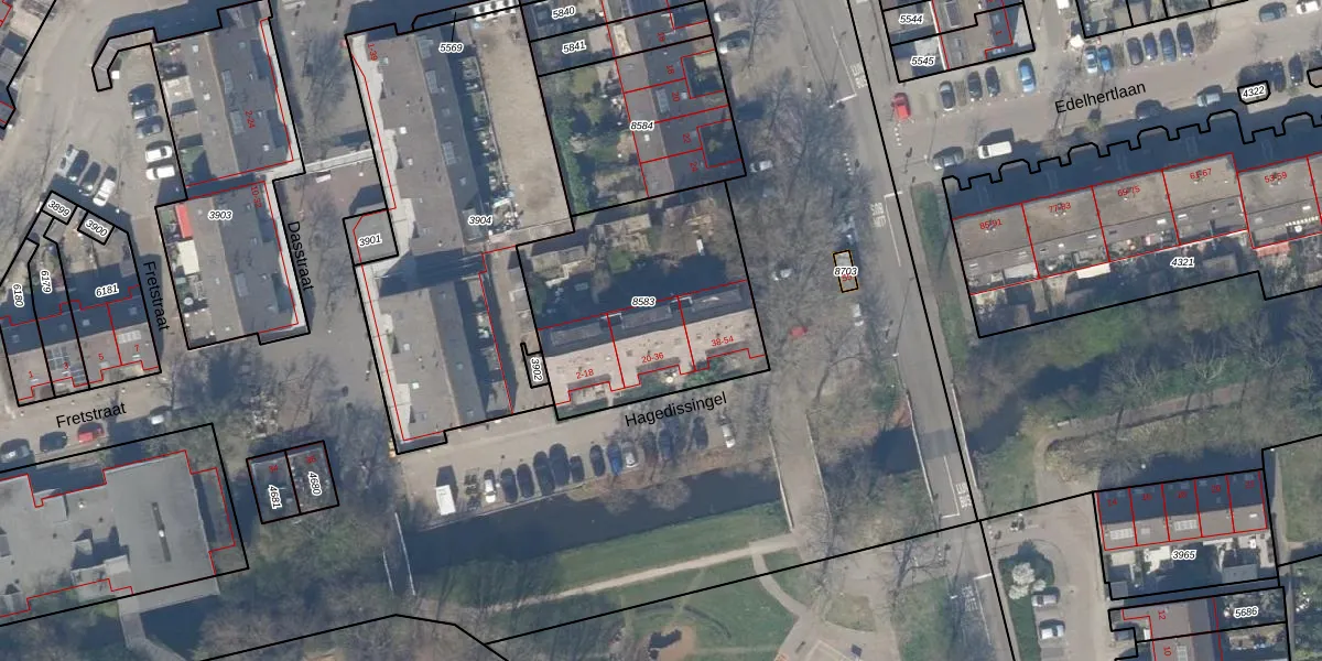 Hagedissingel 26 is gelegen op kadastraal perceel DEL00R8583. Deze kadastrale aanduiding is uniek en wordt gebruikt door het Kadaster om eigendomsrechten en andere zakelijke rechten vast te leggen. Het perceel maakt onderdeel uit van de kadastrale gemeente Delft.