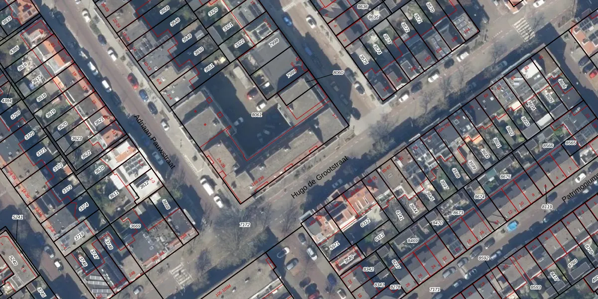 Het perceel waarop Hugo de Grootstraat 170 staat heeft een oppervlakte van 1439 m². Dit is een zeer groot perceel. De perceeloppervlakte wordt geregistreerd door het Kadaster. Gedetailleerde informatie over de maten van dit perceel kunt u vinden in het rapport Kadastrale kaart met maatvoering van Hugo de Grootstraat 170.