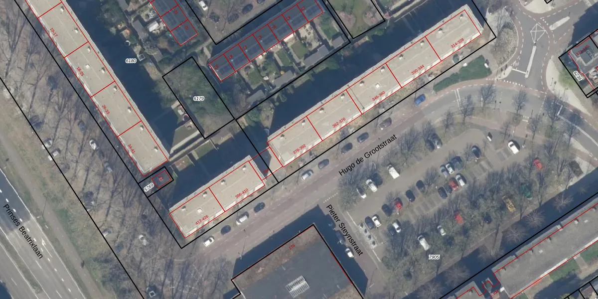 Hugo de Grootstraat 392 is gelegen op kadastraal perceel DEL00F6178. Deze kadastrale aanduiding is uniek en wordt gebruikt door het Kadaster om eigendomsrechten en andere zakelijke rechten vast te leggen. Het perceel maakt onderdeel uit van de kadastrale gemeente Delft.