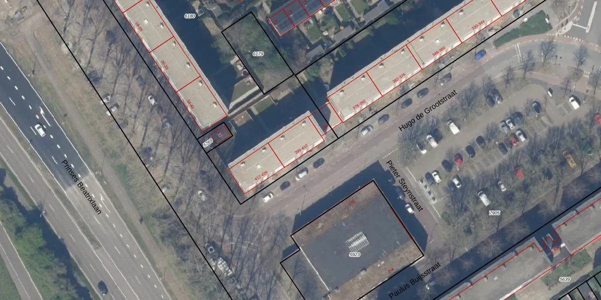 Hugo de Grootstraat 406 is gelegen op kadastraal perceel DEL00F6180. Deze kadastrale aanduiding is uniek en wordt gebruikt door het Kadaster om eigendomsrechten en andere zakelijke rechten vast te leggen. Het perceel maakt onderdeel uit van de kadastrale gemeente Delft.