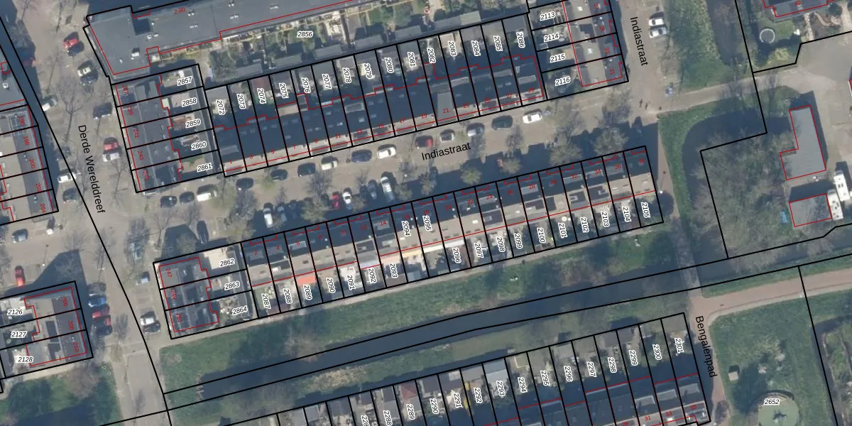 Het perceel waarop Indiastraat 18 staat heeft een oppervlakte van 94 m². Dit is een klein perceel. De perceeloppervlakte wordt geregistreerd door het Kadaster. Gedetailleerde informatie over de maten van dit perceel kunt u vinden in het rapport Kadastrale kaart met maatvoering van Indiastraat 18.