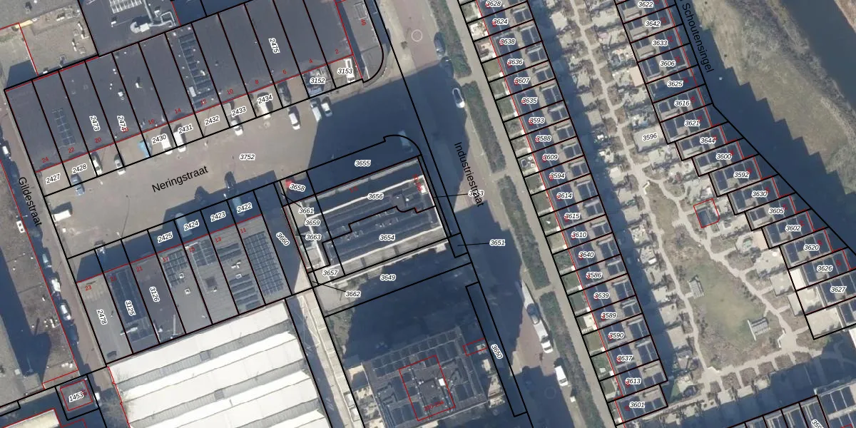 Industriestraat 64 is gelegen op kadastraal perceel DEL00O3654. Deze kadastrale aanduiding is uniek en wordt gebruikt door het Kadaster om eigendomsrechten en andere zakelijke rechten vast te leggen. Het perceel maakt onderdeel uit van de kadastrale gemeente Delft.