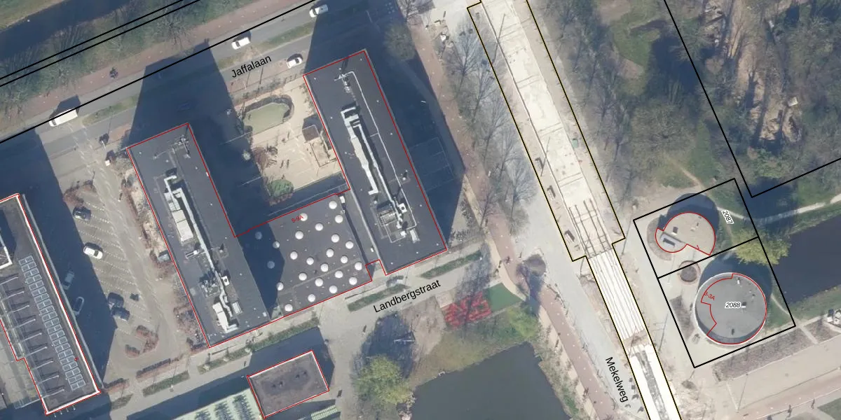 Het perceel waarop Jaffalaan 9-A staat heeft een oppervlakte van 17,4 ha. Dit is een zeer groot perceel. De perceeloppervlakte wordt geregistreerd door het Kadaster. Gedetailleerde informatie over de maten van dit perceel kunt u vinden in het rapport Kadastrale kaart met maatvoering van Jaffalaan 9-A.