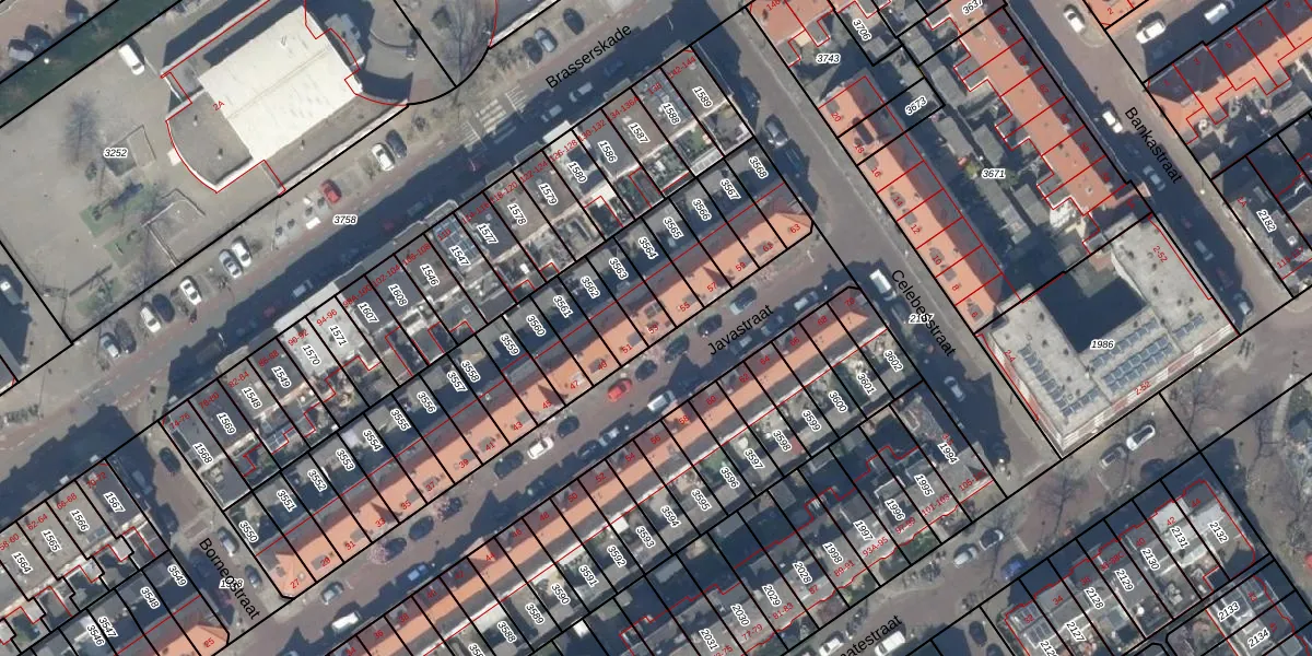 Het perceel waarop Javastraat 53 staat heeft een oppervlakte van 88 m². Dit is een klein perceel. De perceeloppervlakte wordt geregistreerd door het Kadaster. Gedetailleerde informatie over de maten van dit perceel kunt u vinden in het rapport Kadastrale kaart met maatvoering van Javastraat 53.