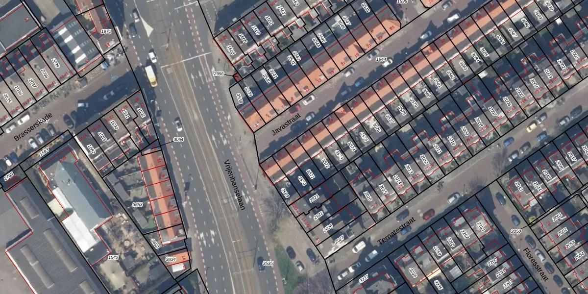Het perceel waarop Javastraat 8 staat heeft een oppervlakte van 92 m². Dit is een klein perceel. De perceeloppervlakte wordt geregistreerd door het Kadaster. Gedetailleerde informatie over de maten van dit perceel kunt u vinden in het rapport Kadastrale kaart met maatvoering van Javastraat 8.