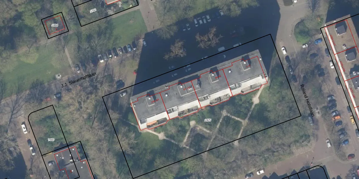 Het perceel waarop J.J. Slauerhofflaan 117 staat heeft een oppervlakte van 4875 m². Dit is een zeer groot perceel. De perceeloppervlakte wordt geregistreerd door het Kadaster. Gedetailleerde informatie over de maten van dit perceel kunt u vinden in het rapport Kadastrale kaart met maatvoering van J.J. Slauerhofflaan 117.