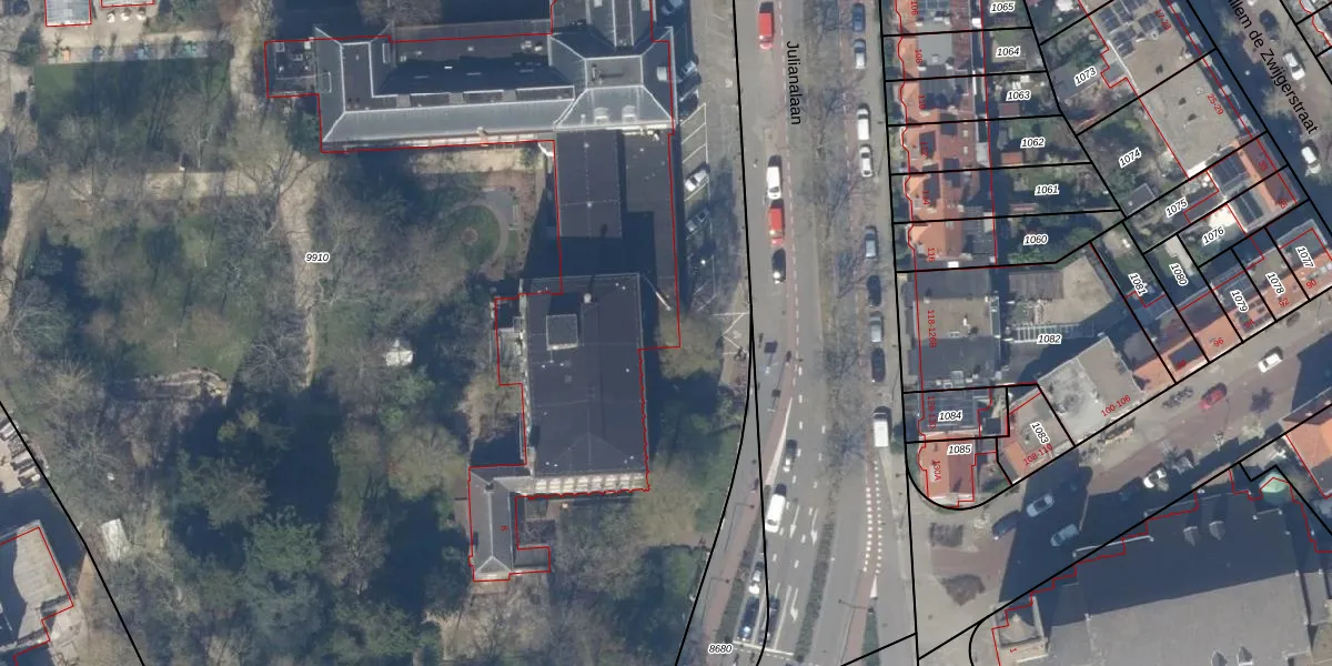 Het perceel waarop Julianalaan 67-A staat heeft een oppervlakte van 2,9 ha. Dit is een zeer groot perceel. De perceeloppervlakte wordt geregistreerd door het Kadaster. Gedetailleerde informatie over de maten van dit perceel kunt u vinden in het rapport Kadastrale kaart met maatvoering van Julianalaan 67-A.