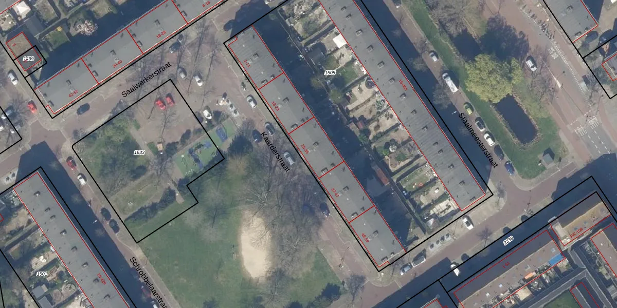 Kaarderstraat 33 is gelegen op kadastraal perceel DEL00O1505. Deze kadastrale aanduiding is uniek en wordt gebruikt door het Kadaster om eigendomsrechten en andere zakelijke rechten vast te leggen. Het perceel maakt onderdeel uit van de kadastrale gemeente Delft.