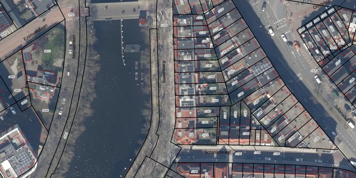 Het perceel waarop Kanaalweg 9-A staat heeft een oppervlakte van 187 m². Dit is een middelgroot perceel. De perceeloppervlakte wordt geregistreerd door het Kadaster. Gedetailleerde informatie over de maten van dit perceel kunt u vinden in het rapport Kadastrale kaart met maatvoering van Kanaalweg 9-A.