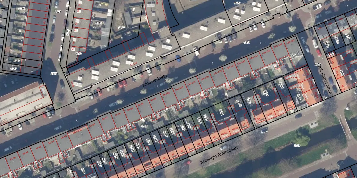 Kloosterkade 104 is gelegen op kadastraal perceel DEL00A8936. Deze kadastrale aanduiding is uniek en wordt gebruikt door het Kadaster om eigendomsrechten en andere zakelijke rechten vast te leggen. Het perceel maakt onderdeel uit van de kadastrale gemeente Delft.