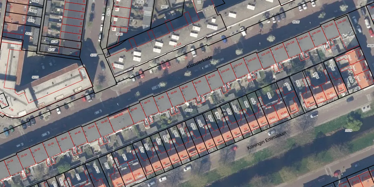 Het perceel waarop Kloosterkade 90 staat heeft een oppervlakte van 3960 m². Dit is een zeer groot perceel. De perceeloppervlakte wordt geregistreerd door het Kadaster. Gedetailleerde informatie over de maten van dit perceel kunt u vinden in het rapport Kadastrale kaart met maatvoering van Kloosterkade 90.