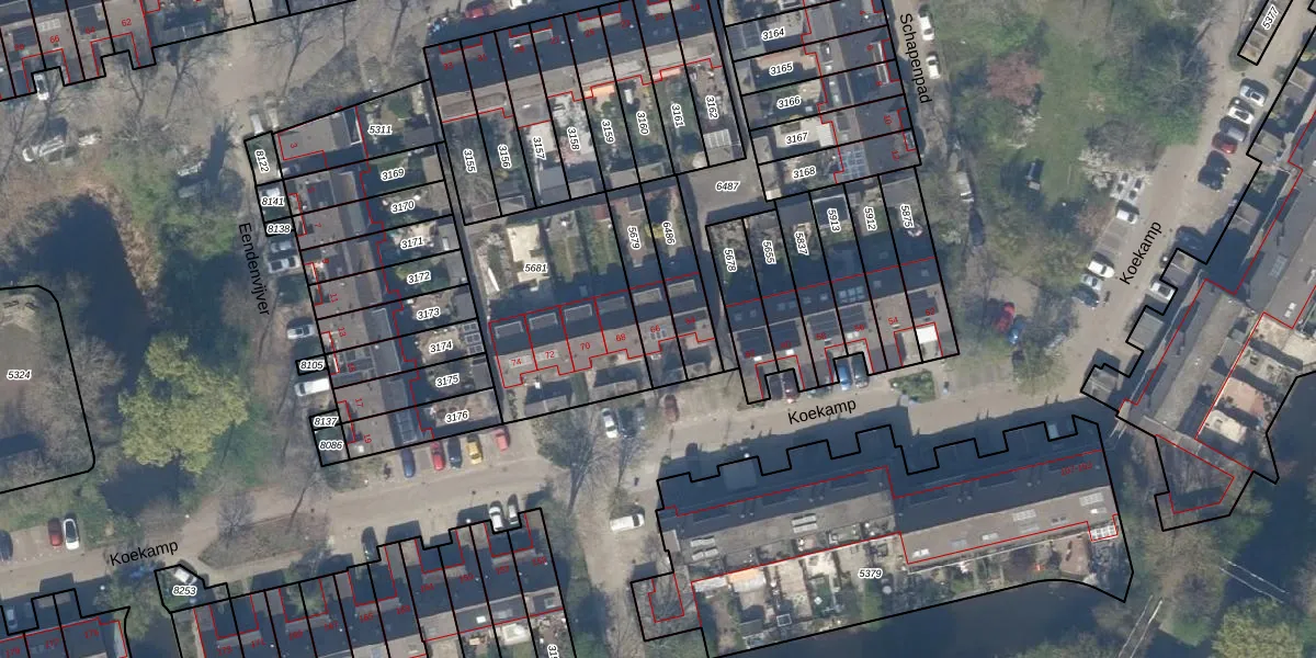Het perceel waarop Koekamp 66 staat heeft een oppervlakte van 167 m². Dit is een middelgroot perceel. De perceeloppervlakte wordt geregistreerd door het Kadaster. Gedetailleerde informatie over de maten van dit perceel kunt u vinden in het rapport Kadastrale kaart met maatvoering van Koekamp 66.