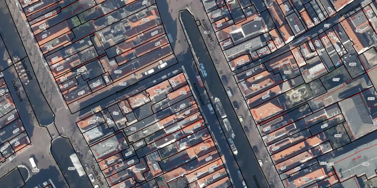 Koornmarkt 105 is gelegen op kadastraal perceel DEL00D1831. Deze kadastrale aanduiding is uniek en wordt gebruikt door het Kadaster om eigendomsrechten en andere zakelijke rechten vast te leggen. Het perceel maakt onderdeel uit van de kadastrale gemeente Delft.