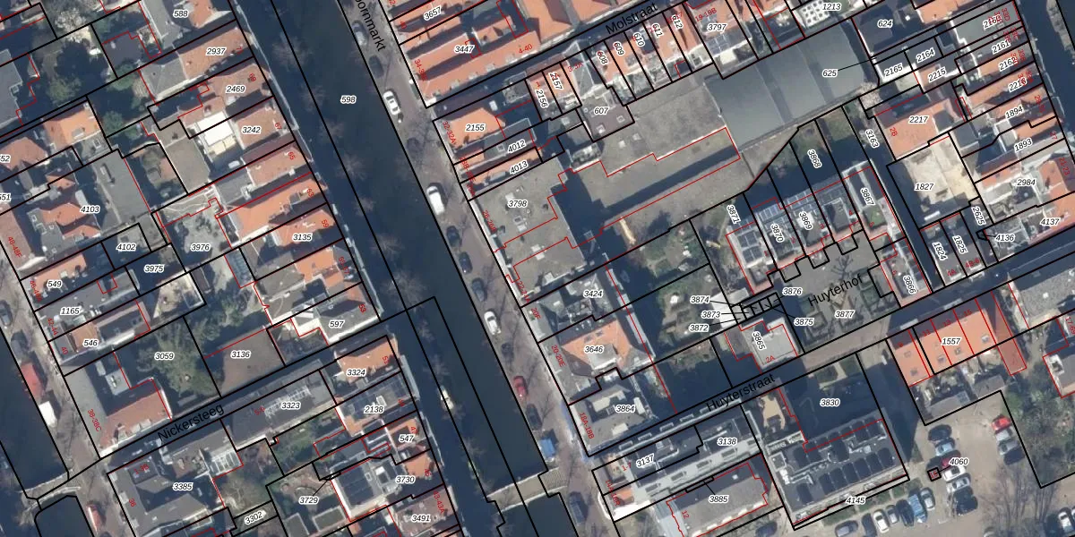 Het perceel waarop Koornmarkt 24-A staat heeft een oppervlakte van 1598 m². Dit is een zeer groot perceel. De perceeloppervlakte wordt geregistreerd door het Kadaster. Gedetailleerde informatie over de maten van dit perceel kunt u vinden in het rapport Kadastrale kaart met maatvoering van Koornmarkt 24-A.