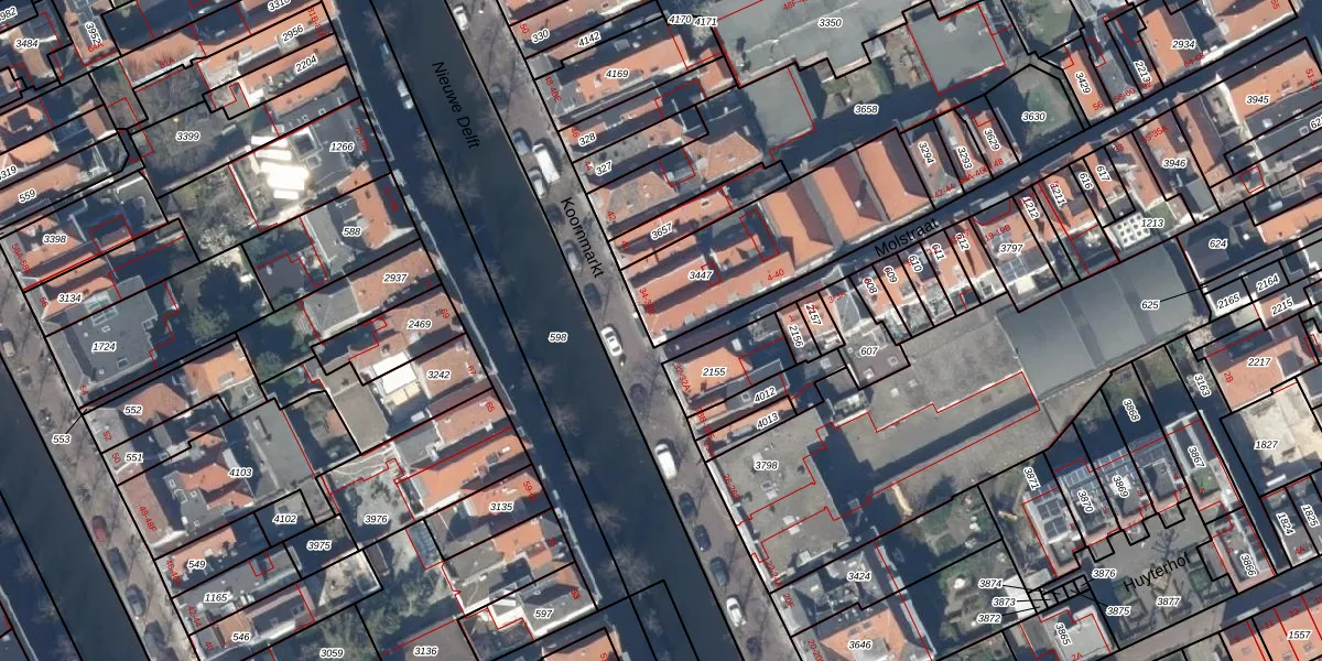 Het perceel waarop Koornmarkt 34 staat heeft een oppervlakte van 633 m². Dit is een groot perceel. De perceeloppervlakte wordt geregistreerd door het Kadaster. Gedetailleerde informatie over de maten van dit perceel kunt u vinden in het rapport Kadastrale kaart met maatvoering van Koornmarkt 34.