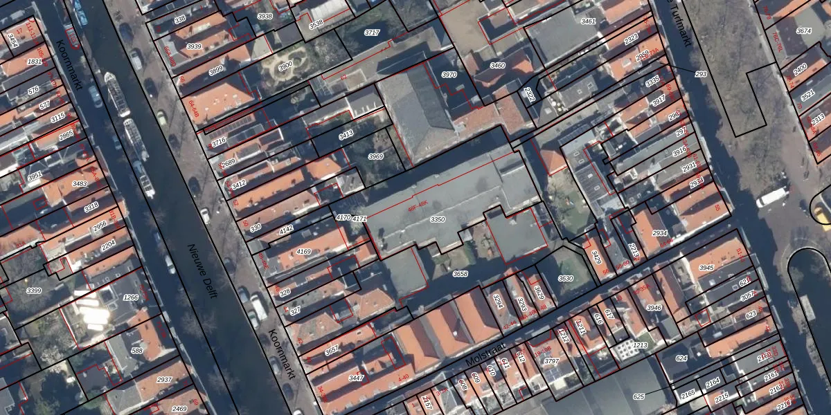 Het perceel waarop Koornmarkt 48-F staat heeft een oppervlakte van 815 m². Dit is een groot perceel. De perceeloppervlakte wordt geregistreerd door het Kadaster. Gedetailleerde informatie over de maten van dit perceel kunt u vinden in het rapport Kadastrale kaart met maatvoering van Koornmarkt 48-F.