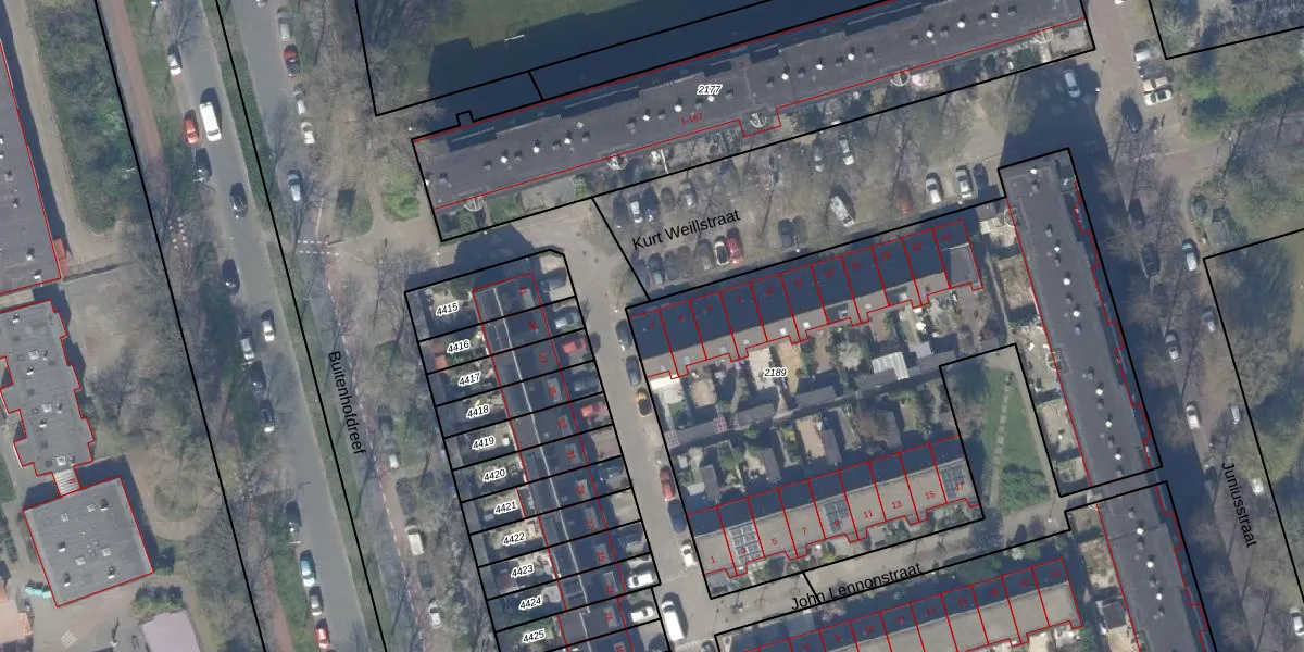Het perceel waarop Kurt Weillstraat 2 staat heeft een oppervlakte van 3105 m². Dit is een zeer groot perceel. De perceeloppervlakte wordt geregistreerd door het Kadaster. Gedetailleerde informatie over de maten van dit perceel kunt u vinden in het rapport Kadastrale kaart met maatvoering van Kurt Weillstraat 2.