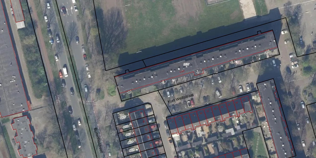 Het perceel waarop Kurt Weillstraat 7 staat heeft een oppervlakte van 1713 m². Dit is een zeer groot perceel. De perceeloppervlakte wordt geregistreerd door het Kadaster. Gedetailleerde informatie over de maten van dit perceel kunt u vinden in het rapport Kadastrale kaart met maatvoering van Kurt Weillstraat 7.