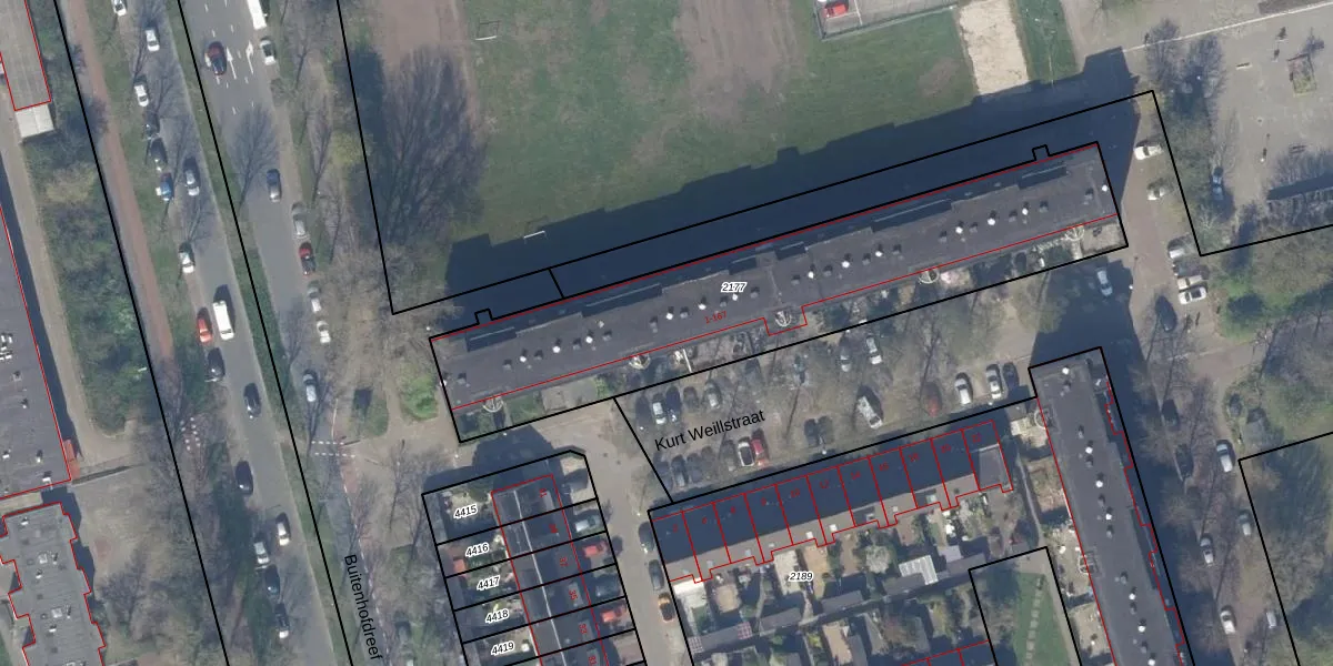 Het perceel waarop Kurt Weillstraat 9 staat heeft een oppervlakte van 1713 m². Dit is een zeer groot perceel. De perceeloppervlakte wordt geregistreerd door het Kadaster. Gedetailleerde informatie over de maten van dit perceel kunt u vinden in het rapport Kadastrale kaart met maatvoering van Kurt Weillstraat 9.