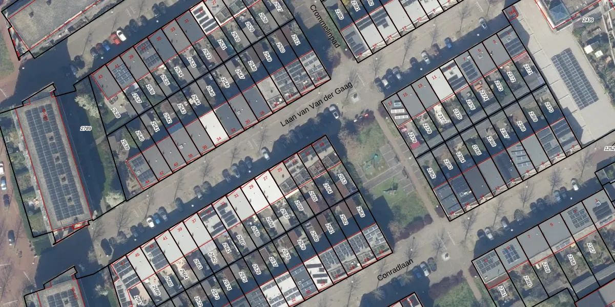 Laan van Van der Gaag 21 is gelegen op kadastraal perceel DEL00O2554. Deze kadastrale aanduiding is uniek en wordt gebruikt door het Kadaster om eigendomsrechten en andere zakelijke rechten vast te leggen. Het perceel maakt onderdeel uit van de kadastrale gemeente Delft.