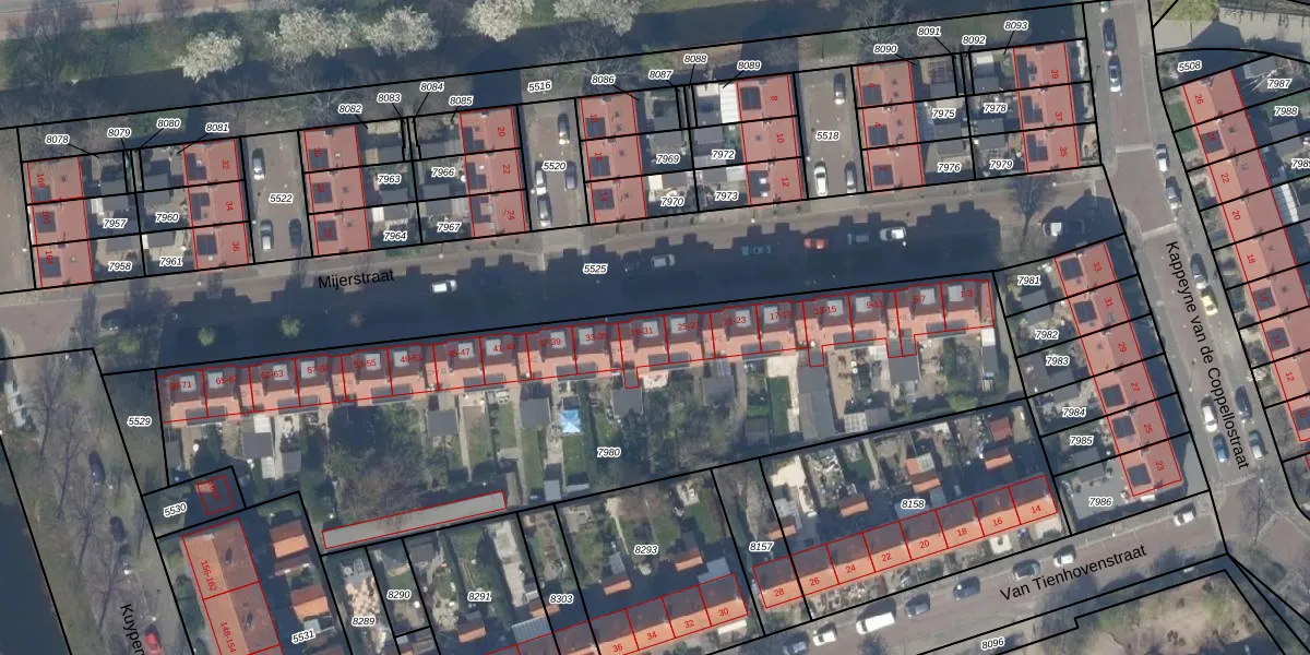 Het perceel waarop Mijerstraat 29 staat heeft een oppervlakte van 3213 m². Dit is een zeer groot perceel. De perceeloppervlakte wordt geregistreerd door het Kadaster. Gedetailleerde informatie over de maten van dit perceel kunt u vinden in het rapport Kadastrale kaart met maatvoering van Mijerstraat 29.