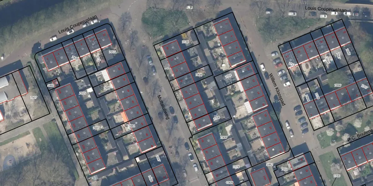 Het perceel waarop Multatuliweg 77 staat heeft een oppervlakte van 2920 m². Dit is een zeer groot perceel. De perceeloppervlakte wordt geregistreerd door het Kadaster. Gedetailleerde informatie over de maten van dit perceel kunt u vinden in het rapport Kadastrale kaart met maatvoering van Multatuliweg 77.