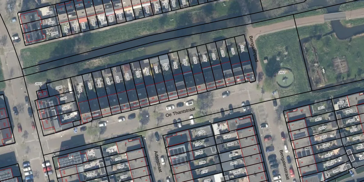 Oe Thantstraat 21 is gelegen op kadastraal perceel DEL00S2294. Deze kadastrale aanduiding is uniek en wordt gebruikt door het Kadaster om eigendomsrechten en andere zakelijke rechten vast te leggen. Het perceel maakt onderdeel uit van de kadastrale gemeente Delft.