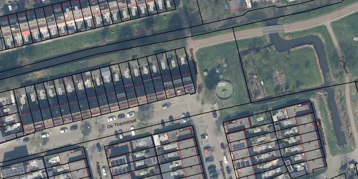 Oe Thantstraat 33 is gelegen op kadastraal perceel DEL00S2300. Deze kadastrale aanduiding is uniek en wordt gebruikt door het Kadaster om eigendomsrechten en andere zakelijke rechten vast te leggen. Het perceel maakt onderdeel uit van de kadastrale gemeente Delft.